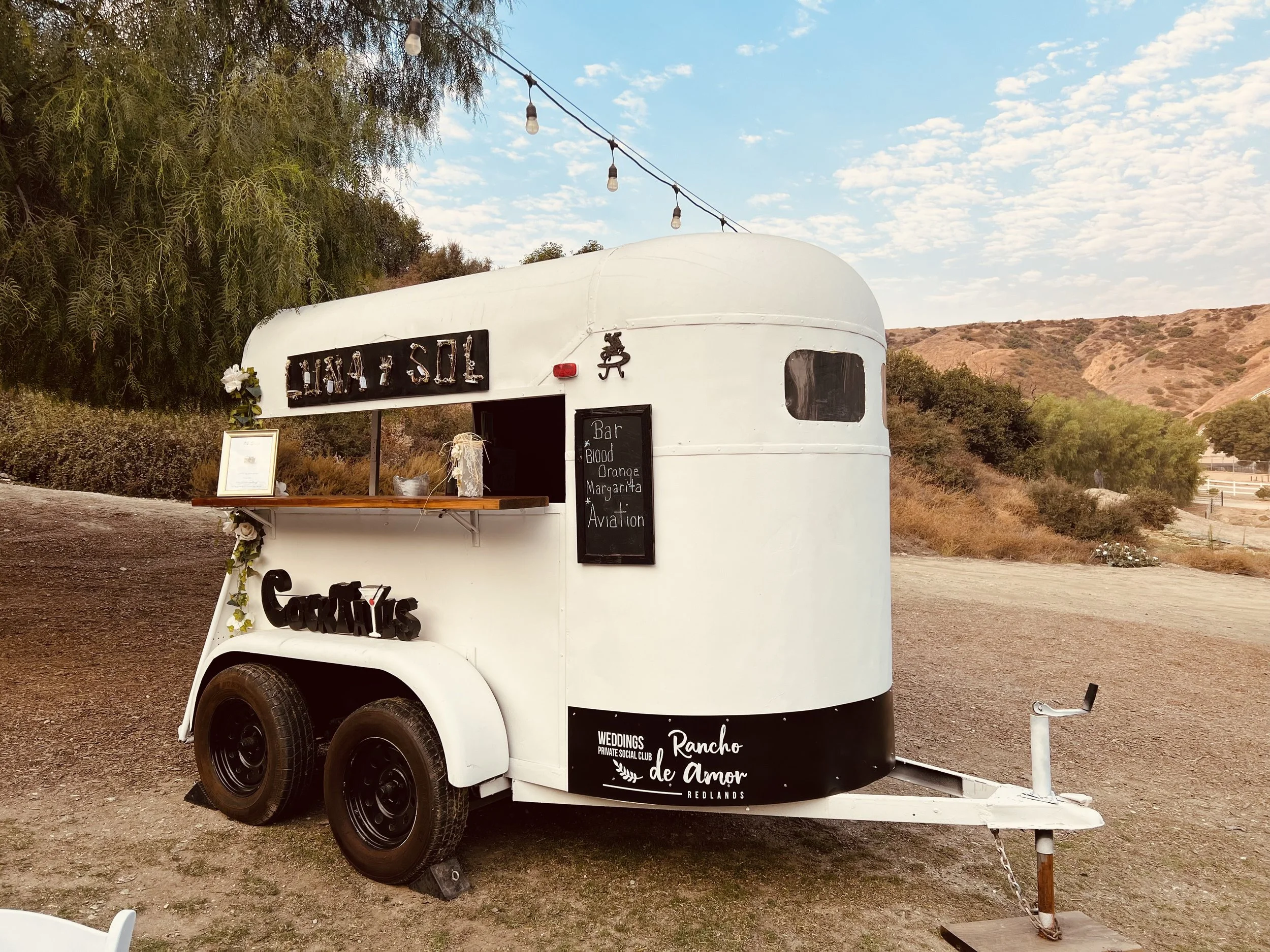 Luna y Sol, our mobile horse trailer bar, as an rustic secondary bar option for your event. This distinctive space provides versatile functionality to showcase a variety of curated beverage experiences